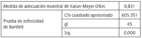Al considerar el bajo poder predictivo que tiene un análisis factorial para muestras pequeñas, debe analizarse que exista una adecuación muestral suficiente que permita validar los resultados obtenidos por este análisis factorial. Por esta razón, una vez eliminadas las cargas factoriales bajas, se determinó que el índice de adecuación muestral Kaiser-Meyer-Olkin (KMO) fue apropiado con un valor de 0,827, y el test de esfericidad de Barlett resultó significativamente alto con un p-valor de 0,000 (tabla 6).