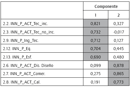 El segundo factor está referido a la innovación en productos (INN_PROD), e incluye tres ítems vinculados a las actividades de innovación en diseño, comercialización y calidad. Para este último factor, el porcentaje de varianza explicada fue de 33,33%. De igual forma, el porcentaje de varianza explicada por los dos factores de la innovación es de 68,45%.