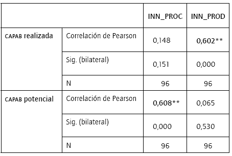 Además, se muestra que existe una relación entre la CAPAB realizada y las actividades de innovación en productos (INN_PROD), con una significatividad alta y positiva. No obstante, se puede afirmar que no existe una relación significativa entre la CAPAB realizada y la innovación en procesos (INN_PROC).