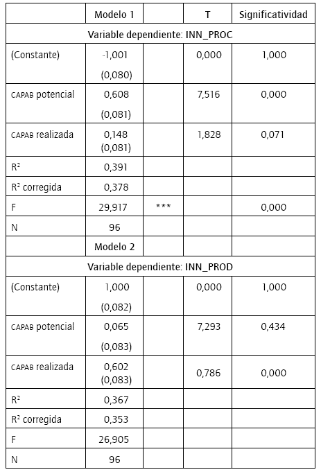 Con base en lo anterior, se decidió utilizar en el análisis de regresión dos modelos, considerando como variables independientes las dos dimensiones de la CAPAB y como variables dependientes, la innovación en procesos (INN_PROC) y la innovación en productos (INN_PROD). En la tabla 9 se muestran los resultados de dicha regresión.