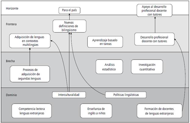 En las figuras 1, 2 y 3 se pueden apreciar los MTC de diferentes grupos de investigación y, al interior, los conocimientos críticos que les corresponde. Por ejemplo, en la figura 1 los temas Visión artificial y Paralelismo son líneas de investigación del grupo, lo que implica que son temas de dominio de los integrantes. En la figura 2, los temas Análisis estadístico e Investigación cualitativa son conocimientos de brecha que, aunque no pertenecen al campo de investigación del grupo, son temas que se deben aprender y dominar para ser más competitivos en su área de conocimiento. En la figura 3 se pueden ver temas como Polaritones y Excitones que se consideran en la frontera del conocimiento, y que el grupo aún no los ha desarrollado, pero son los que marcan la tendencia internacional en investigación y sobre los cuales se está generando conocimiento de punta. Entre estos mapas solo podemos observar uno en el que se identifica un horizonte, que se puede apreciar en la figura 2, en el que Nuevas definiciones de bilingüismo para el país es un objetivo a largo plazo trazado como un ideal, una transformación social que se busca conseguir a través de las investigaciones.