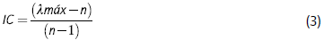 Para os critérios e cada grupo de subcritérios, foram feitos os julgamentos comparativos dos quatro especialistas da área para se obter uma classificação local e uma geral das prioridades de riscos. A tabela 3 demonstra os vetores de prioridades dos critérios. Todos os julgamentos foram consistentes (CR < 10%). A variação do CR foi de 0 até 8,71°%, o que demonstra que os especialistas entenderam que estavam sendo julgados e a dinâmica das comparações.