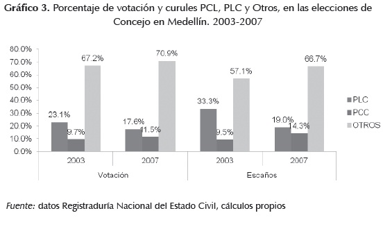 Estos mecanismos que se acaban de mencionar no se desligan del proceso de reacomodamiento, que se mostrará a partir del análisis de los datos electorales agregados de los partidos en las elecciones de 2003 y 2007. El soporte metodológico sigue estando en el cálculo de los indicadores usados en la sección uno para su comprobación. Efectivamente, los movimientos no tradicionales lograron aprovechar una estrategia heredada de los tradicionales, combinada con la oportunidad que ofrecía el voto preferente para valerse de los esfuerzos individuales de los candidatos y soportar en ellos la ampliación de oportunidades en la búsqueda de curules para sus partidos o movimientos. Los resultados electorales reflejan estas dinámicas, en 2003, los no tradicionales captaron el 67,2% de los votos totales, el PLC obtuvo el 23,1% y el PCC el 9,7%, lo que en escaños significó 12 curules para los nuevos partidos (57,2%), siete para el PLC (33,3%) y dos para el PCC (9,5%). En 2007, la situación sigue favoreciendo a los partidos no tradicionales a pesar de que se presentó menor número de listas, logrando la mayoría de la votación (70,9%), dándoles dos curules más que en 2003 (14 escaños), mientras que la votación del PLC descendió a 14,4%, costándole tres curules, y el PCC aumentó la participación de su votación a 11,2%, ganando un escaño más (gráfico 3).