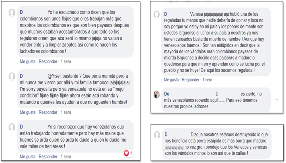 La usuaria D, a pesar de reconocer que hay venezolanos «buenos», termina por afirmar que la mayoría son vándalos. En un artículo titulado ¡ojo con la xenofobia!, publicado ocho días después de los acontecimientos de pánico colectivo, se pondera las acusaciones que podrían agravar la situación humanitaria de los migrantes. Los datos de la Fundación Ideas para la Paz afirman que 74,5% de los trinos de Twiter son comentarios despectivos hacia los venezolanos (Semana, 2019, noviembre 30).