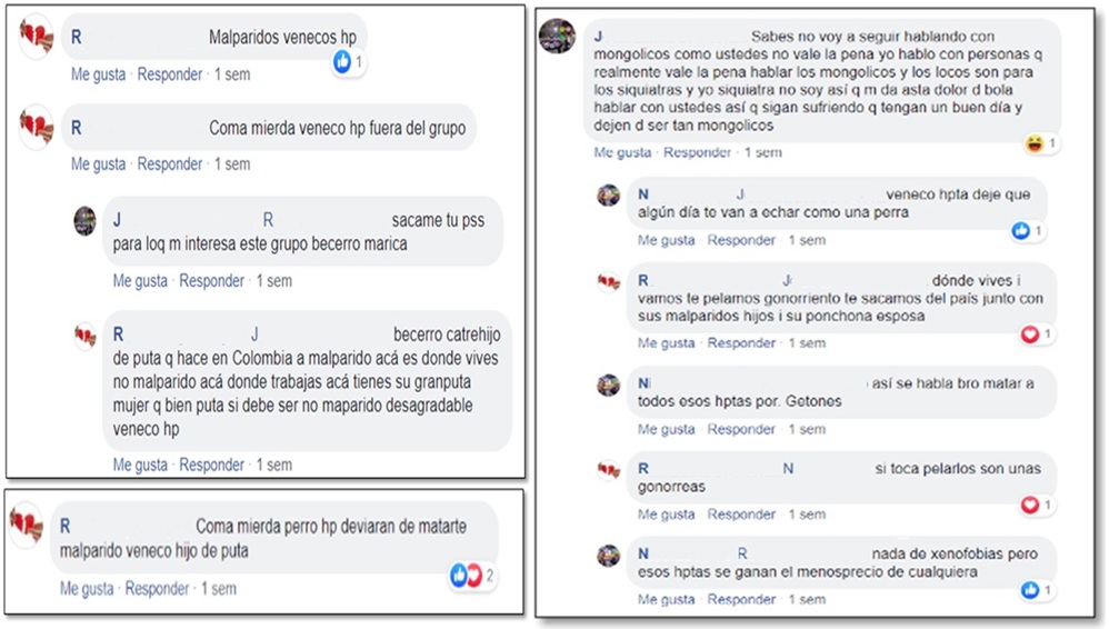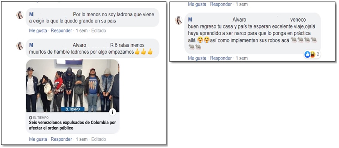 La usuaria M (comunicación personal, noviembre 22, 2019), que aparece en los comentarios de la Gráfica 2, utiliza cifras referentes a la expulsión de venezolanos. Para reafirmar su argumento, aunque miembros de la Agencia de la ONU para los Refugiados (ACNUR) han señalado que este tipo de información se reproduce sin fundamento y no está sustentada en bases sólidas que permitan relacionar la criminalidad del país con estas personas; de hecho, en cifras generales emitidas por Migración Colombia, se estiman que en el país se encuentran 1 488 373 de venezolanos, de los cuales solo se han expulsado 1100, es decir, el 0,07 % (Semana, 2019, noviembre 30). A pesar de todo, la percepción de inseguridad fomentada en la redes sociales apunta a encontrar el foco de riesgo en esta población.