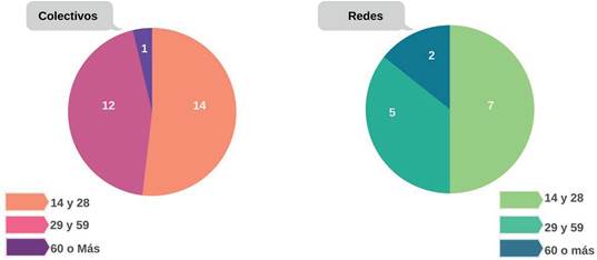 La acción colectiva es agenciada mayoritariamente por jóvenes, dado que, como se muestra en la Gráfica 1, los rangos de edad de los integrantes de los colectivos y redes son principalmente entre los 14 y 28 años, seguido de las edades de 29 y 58 años; en menor medida, los colectivos y redes cuentan con integrantes de edades correspondientes a los 60 años en adelante.