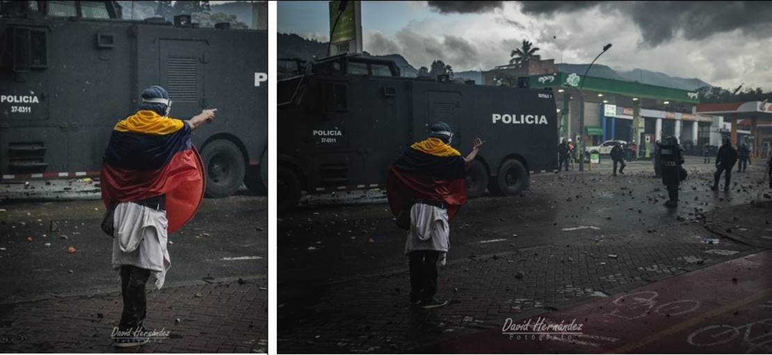La secuencia tomada en Medellín por el fotógrafo David Hernández Ospina (3 de junio 2021) expresa este nuevo tipo de manifestación de los agentes. Georges Didi-Huberman (2020, p. 410) nos recuerda que en la manifestación aparece el gesto, las manos, los brazos extendidos: el cuerpo entero. ¿Qué es entonces lo que se manifiesta en esta secuencia?