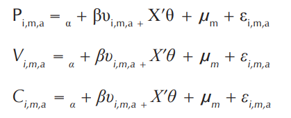 El modelo de estimación a partir del cual se busca determinar la incidencia de la afectación en la participación es el modelo de probabilidad lineal (MPL). Este método es pertinente cuando se busca estimar los efectos marginales en una variable dependiente binaria y establecer términos de interacción dentro de un modelo (Chatla y Shmueli, 2013). Por tanto, se tomaron tres variables dependientes a partir de un conjunto de individuos i, en determinados municipios m y, en los modelos que lo requirieron, asociados a un año a en específico: la variable P i,m,a hace referencia a la asistencia a manifestaciones públicas; la variable V i,m,a indica el voto para las elecciones presidenciales; y la variable C i,m,a da cuenta de la asistencia a reuniones de cabildo abierto o sesión municipal.