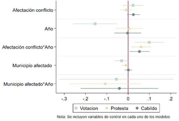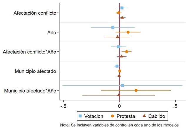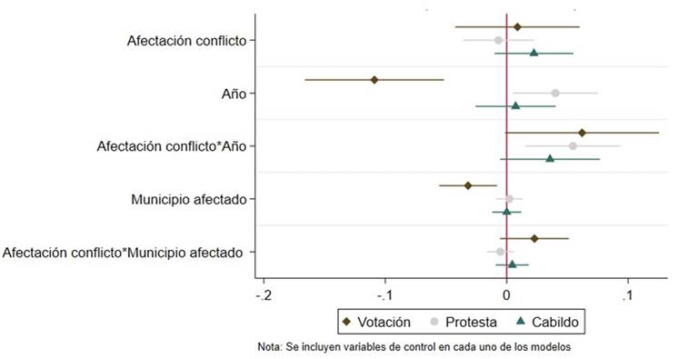 El desarrollo del proceso de paz entre las FARC-EP y el Gobierno nacional consolidó un periodo de desescalamiento del conflicto, razón por la cual se hace necesario determinar si la participación política cambia en sus diferentes manifestaciones después de 2016, tras la firma el Acuerdo de paz, y desde 2012, cuando se inició el proceso. En este sentido, se generó una variable de interacción por año para identificar si al cambiar de un periodo a otro la probabilidad de participar en política también varía. Vale la pena aclarar que se analiza el periodo en cuestión porque, si bien el Acuerdo de paz fue suscrito en 2016, la transición y consolidación hacia un periodo de reducción de violencia y desescalamiento del conflicto se solidificó durante los años que antecedieron a la firma.