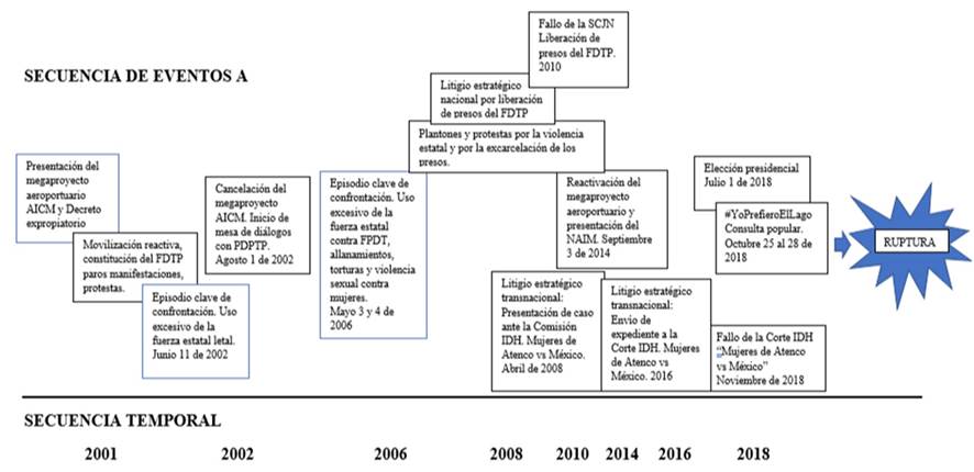 El anuncio del proyecto y los decretos expropiatorios se convirtieron en el episodio a partir del cual se desencadenó la secuencia de eventos A (véase Gráfica 1) con procesos de reacción-contrarreacción (Mahoney, 2000). Tanto el proyecto como los decretos fueron emitidos sin haber realizado ningún tipo de consulta a las comunidades afectadas directamente, las cuales no hicieron esperar su respuesta. Ejidatarios organizados, poderes locales, organizaciones sociales y comunidad en general afectada con los decretos expropiatorios y la decisión de imposición del megaproyecto llevaron a cabo protestas, paros, movilizaciones y bloqueos de vías, las cuales fueron masivas y sostenidas durante los meses siguientes, configurando el primer gran conflicto social del gobierno de la alternancia democrática (Ortega, 2005). Por otro lado, el Ayuntamiento de Texcoco -gobierno local- interpuso acciones jurídicas con una demanda sobre los Decretos del 22 de octubre de 2001, alegando inconstitucionalidad del Acto Ejecutivo (Ruiz de la Peña, 2003).