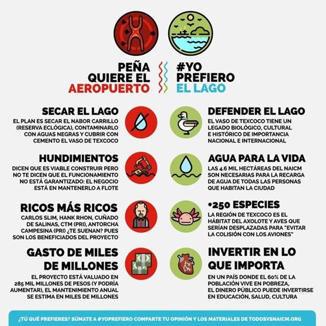 Los argumentos a favor del NAIM hicieron hincapié en la capacidad para movilizar pasajeros en este megaproyecto y la saturación del Aeropuerto Internacional de la Ciudad de México, la inversión realizada hasta 2018 con adelantos de 20% de la obra, así como la generación de empleos directos e indirectos. Los argumentos para la cancelación del NAIM subrayaron el muy significativo sobrecosto de la obra, así como el retraso con fecha incierta de término; por otro lado, el daño ecológico y la importancia del lago de Texcoco como captador de carbono, lugar de llegada de aves migratorias y otras especies, así como dispositivo natural para la prevención de inundaciones en la Zona Metropolitana de la Ciudad de México. Para 2018 sus costos se habían elevado a MEX$285 mil millones (US$13 300 millones). También se subrayó el alto costo de mantenimiento para garantizar la seguridad de un aeropuerto construido en un terreno fangoso de estas características.