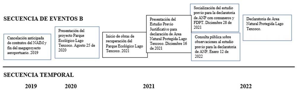 Una vez posesionado, el presidente Andrés Manuel López Obrador inició la secuencia de eventos B (véase Gráfica 3) cuyo episodio fundante fue el anuncio del proceso de anulación del NAIM, con la cancelación anticipada de contratos en una obra que contaba en el momento con altos sobrecostos, así como con problemas técnicos (Jiménez, 2022). En su lugar, se presentó en 2020 el proyecto del Parque Ecológico de Lago Texcoco a través del cual se restaurarán más de 12 200 hectáreas en el principal vaso regulador hídrico de la megaurbe.