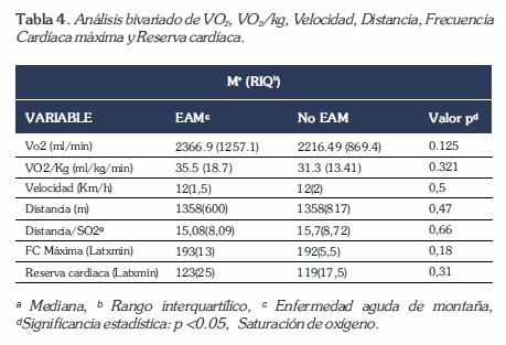 Al comparar las características entre sujetos con enfermedad aguda de montaña con sujetos sin la misma no se encontraron diferencias en peso, talla, índice de masa corporal, frecuencia cardíaca, tensión arterial, saturación de oxígeno ni temperatura tanto en reposo como en ejercicio (Tabla 3).