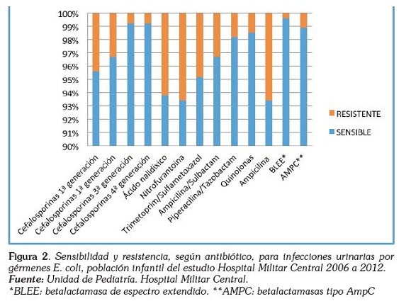 Introduction: the urinary tract infection is one of the most common bacterial infections in children (representing 7%), and it's early diagnosis and treatment could impact in complications. That is the reason why the empirical antibiotic used for treatment, is directed to the most frequent microorganisms. In the antibiogram revision, Escherichia coli (E. coli) sensibility reported in 2002 in The Military Central Hospital was satisfactory (86%) to continue the same first line of treatment (cephalotin) in children with febrile urinary tract infections. In many national and international studies has been reported an increase in the resistance to first level cephalosporins, with consequent changes in first line treatment. However, the changes in the sensibility in the last years in our hospital is unknown, also, if there are hostage factors that affect this changes in the sensibility.