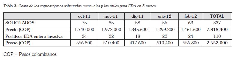 A partir de los datos descritos anteriormente se calculó el número de coproscópicos realizados entre octubre de 2011 y febrero de 2012, de estos se tomaron los que se consideraron diagnósticos en enfermedad diarreica aguda invasiva y se estimó su costo en pesos colombianos, de acuerdo con su valor unitario en el Hospital de Vista Hermosa de $23.200 (COP) (tabla 2 y 3, gráfica 1).
