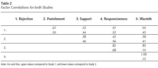 Conversely, the Support factor showed content communicating positive reinforcement and availability. Items in the Responsiveness factor represented expectancies of responsibility, empathy and positive affect. Finally, items loading in the Warmth factor reflected friendship, closeness and warmth. Contrasting with Baumrind's typologies, referred to disciplinary styles, the present findings support those dimensions involved in parental practices relevant to emotional expression and adjustment.