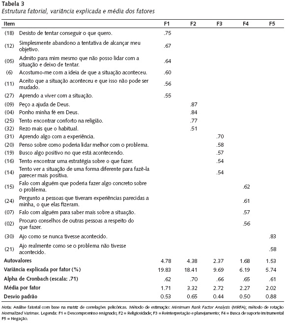 Os dados da escala de coping mostraram-se satisfatoriamente fatoráveis (KMO=.76, χ2 (435)=2260.6,p<.001; determinante da matriz=.002) e a análise de Horn indicou a retenção de cinco fatores. A variância total explicada pela estrutura empírica selecionada é de 59,86%, levando à retenção de 21 dos 32 itens originais. Os pesos fatoriais são moderados: os mais elevados foram de |.87| e |.83|, e os demais variaram entre |.54| e |.75| (Tabela 3).