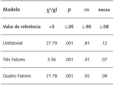 Tendo em vista que o modelo de três fatores foi o que se mostrou mais adequado, foram calculados, a partir da análise dos índices de ajustamento, os valores de confiabilidade e as cargas fatoriais dentro deste modelo. Os resultados são apresentados na Tabela 2.