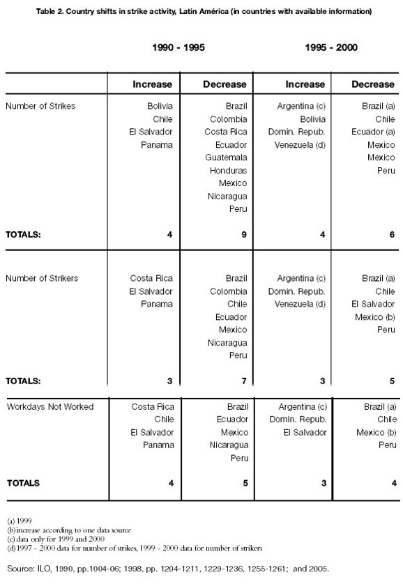 But by the 1990s formal sector workers found themselves unable to hold on to their recent gains. The new democracies did not formally retract labor rights, as had the military regimes, but they did not protect workers from the labor-unfriendly "invisible market." The removal of trade barriers subjected workers to global market competition which, in effect, weakened their labor power. Against this backdrop, labor strife tapered off, and jobs protected by labor laws contracted. According to country data reported to the International Labor Organization (ILO), the number of strikes, the number of workers involved, and the number of lost workdays declined in more countries in the region than it increased (see Table 2)4. Strike activity tapered off even though employment insecurity rose, income inequality increased, average industrial salaries barely recovered and the minimum wage remained below levels of 1980 (www.eclac.org/publicaciones/DesarrolloSocial/0/LCL.222OPE/Anexo_Estadistico_version_preliminar.els).