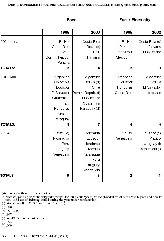 Table 3 gives a sense of why cost of living increases stirred collective rage. Between 1990 and 1995, as well as between 1990 and the century's turn, food prices in most countries at least doubled. By the end of the 1990s eight countries experienced more than a five-fold increase in food costs. The food index, of 100 in 1990, rose to over 1,000 in Ecuador, Peru, Uruguay, and Venezuela.