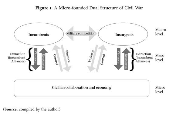 The concept of alliance is presented by Kalyvas as a complementary mechanism at the meso level of his multi-level approach (see Figure 1). Its inclusion makes it possible to connect the complex microstrategic interactions of armed actors during civil war (structured through the joint production of violence) to their economic context by considering extraction as a form of alliance between civilians and belligerents.5