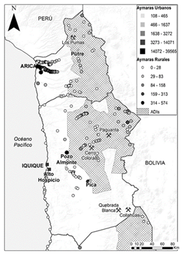 De esta forma, el Estado ha producido una nueva geografía aimara, a través de la aplicación de la política pública indígena: por una parte, ha aumentado el número de comunidades y asociaciones indígenas que conectan el territorio originario del altiplano y la precordillera con la población indígena que vive en zonas urbanas, como Iquique y Alto Hospicio. Por otra parte, se reconoce a las comunidades como organizaciones que tienen presencia territorial y que demandan el control de la tierra y el agua, fuertemente presionadas por el crecimiento urbano y el boom minero. Por último, se crean las ADI como forma de reconocer un territorio para la población indígena, donde se focalizan recursos para mejorar la calidad de vida de las comunidades y, al mismo tiempo, la sustentabilidad del territorio. Como muestra la figura 1, la mayor cantidad de población que se autoidentifica como aimara no vive en las ADI rurales y precordilleranas, sino en las zonas urbanas costeras. Esto nos parece un hecho central, dado que el espacio de reproducción de la cultura aimara hoy está anclado con fuerza en las ciudades, pero siempre con referencia a la zona andina, donde está el territorio con el que tienen un lazo afectivo y religioso.
