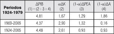 Tabla 4. Crecimiento del producto total y por trabajador, capital total y por trabajador, y trabajo, 1905 - 2005. (Variaciones porcentuales medias)13