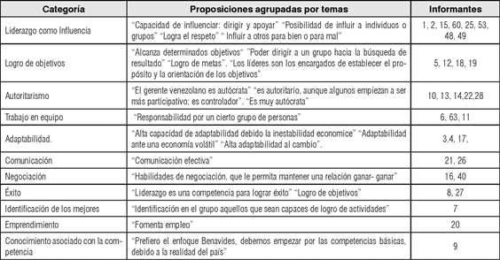El proceso de categorización estuvo relacionado con la forma como se clarificó, conceptualizó o codificó, un término o expresión en forma clara o inequívoca (categoría descriptiva) el contenido o idea central de cada unidad temática. Las categorías establecidas fueron seleccionadas de acuerdo a la opinión de la mitad de los entrevistados, como nuclear y las periféricas, aquellas que no fueron tan frecuentemente referidas por los informantes. En este sentido, se hizo necesario definir y explicar el significado que los protagonistas le otorgaron a las RS del liderazgo desde su propia perspectiva. Posteriormente, se procedió a organizar la información, de acuerdo con las categorías identificadas a fin de iniciar el análisis articulado de la información, relacionando los elementos de la categorización con las tendencias identificadas para lograr comprensión integral de las significaciones imaginarias detectadas, permitiendo mostrar un cuerpo de representaciones sociales sobre el liderazgo.