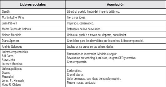 Al triangular los resultados de las entrevistas con los del focus group. Cabe destacar la asociación de las competencias de liderazgo, con líderes mundiales y nacionales (ver tabla 2) de la talla de Gandhi y Nelson Mandela como "líderes sociales: conciliadores" "pacifistas", así como referencia a personajes como Hitler, Fidel, Chávez, como líderes políticos, definidos en cuanto al anclaje, consiste en la incorporación de los eventos, acontecimientos, significados extraños a categorías y nociones familiares dentro de un grupo social específico. Este proceso de anclaje depende de la difusión de conocimientos y creencias en diferentes grupos sociales (Clémence, 2001; Jodelet 1986).