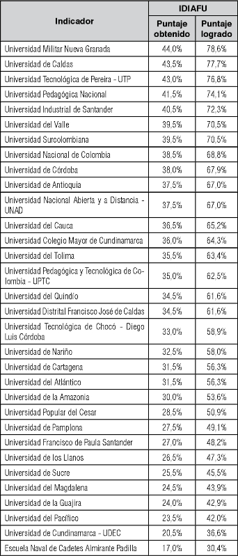 Se obtiene que las universidades que tienen vínculos con las fuerzas militares de Colombia encabezan y cierran la tabla de puntuación del índice, siendo la Universidad Militar Nueva Granada la de mejores resultados y la Escuela Naval de Cadetes Almirante Padilla la que menor grado de revelación y divulgación de información hace a través de internet. En el caso de esta última, puede existir una explicación en los resultados obtenidos en la medida que al ser una universidad especializada en carreras militares y tener poca comunidad académica, no requiere de la divulgación extensa de la información en internet.