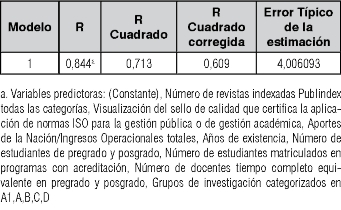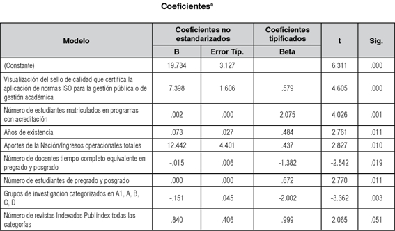 Para determinar los factores que explican o caracterizan a las universidades que revelan y divulgan su información académico-financiera a través de sus sitios web, se realiza una regresión múltiple teniendo en cuenta las 13 variables propuestas en el diseño de la investigación. Sobre estas variables se aplica el método denominado "Atrás" en el SPSS, el cual sirve para depurar las variables y obtener aquellas que explican en mayor medida la variable dependiente.