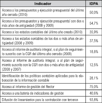Adicionalmente, las universidades públicas en Colombia se encuentran sujetas al control por parte de la Contraloría General de la República (CGR) o de las contralorías territoriales, frente al manejo adecuado de los recursos públicos. Al respecto, se esperaría que se presentara el informe de dicho ente público para que los ciudadanos se enteraran si la información que se divulga es verificada y responde a una concepción del manejo adecuado de los recursos que transfiere el gobierno nacional o territorial a dichas instituciones. La observación realizada muestra que la divulgación de este informe con respecto a las cuentas del año 2009 es sólo del 18.8% y frente a años anteriores es del 12.5%, lo cual es un nivel muy bajo para una información que es relevante para los distintos grupos de interés.