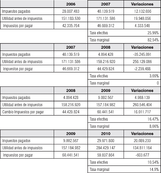 El costo de capital en los años 2006 a 2009 aumento con el efecto de los impuestos (Tabla 12), siendo contrario a lo que se esperaba, por el alto nivel de apalancamiento que poseía la empresa en ese momento. Esto hizo que el riesgo aumentara y que el costo accionario también lo hiciera, pero en mayor proporción, no siendo compensado por el beneficio tributario de la deuda. Para el año 2010, disminuye el costo de capital con el efecto de los impuestos, compensado por el beneficio tributario. De esta manera, el costo accionario aumenta en mayor proporción que con los impuestos nominales porque las tasas efectivas son más bajas.