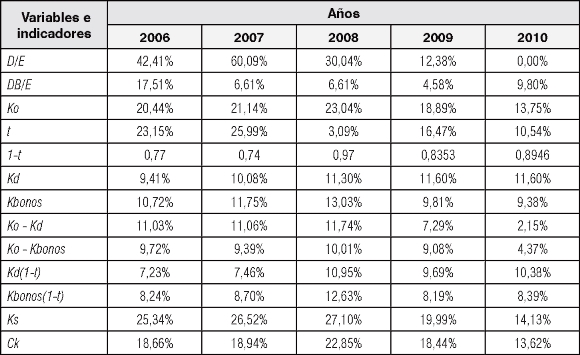 Para el año 2006 el costo accionario fue de 20,44% y costo de capital fue de 16,45%, para el año 2007 el costo del capital accionario se incrementó en un 21,14% lo que hizo que también el costo de capital aumentará a un 16,78%. Esto principalmente por un mayor valor de la tasa libre de riesgo y del costo de la deuda. Para el 2008, el costo del capital accionario y el costo del capital aumentaron principalmente por una mayor tasa libre de riesgo y mayores costo de la deuda Para el año 2009, el costo del capital accionario disminuyo a 18,89%, principalmente por un menor tasa libre de riesgo y un menor beta, lo que hizo que el costo de capital también disminuyera. Finalmente, para el año 2010 el costo del capital accionario disminuyo debido a una disminución sustancial en el beta.
