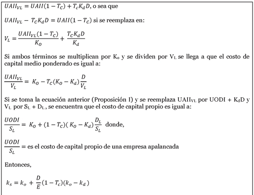 En esta tesis los autores consideran el efecto de los impuestos en la estructura de capital. Con ésta co-rrigi°ron su Proposición I, reconociendo las grandes ventajas tributarias en el valor de la empresa así: