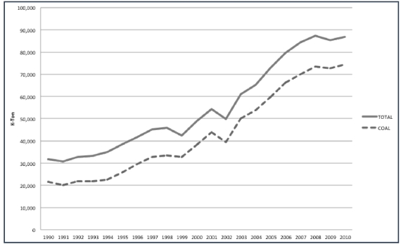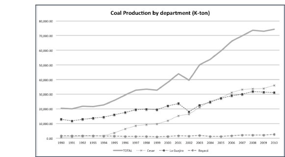 There is no doubt that as in the rest of developing economies and emerging markets, the extractive industry has became economically important, in Colombia it also has been as well. In Colombia, mining has increasing its total production during last 20 years (Figure 1). Total production, without emeralds, has become almost threefold; it was 31.750 K-ton in early 90's and has increased up to 86.750 K-ton in 2010. From such production, coal represented near 67% at the beginning of this period, and has reached 85% nowadays, approximately. Other minerals like Cooper or precious metals like Silver or Gold, have not significant weight over the total production.