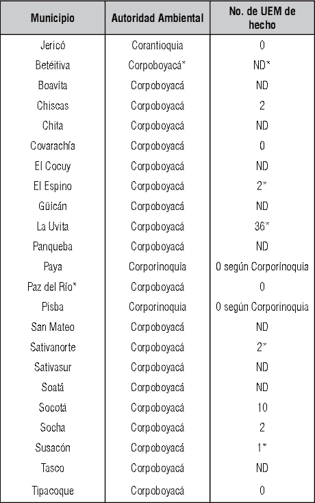 13 Note for correction: When author of this table refers to Jericó, it is a municipality in Boyacá with the same name of another municipality in Antioquia, where environmental Authority is Corpoantioquia. However, concerning to Jericó (Boyacá) the environmental Authority is Corpoboyacá.