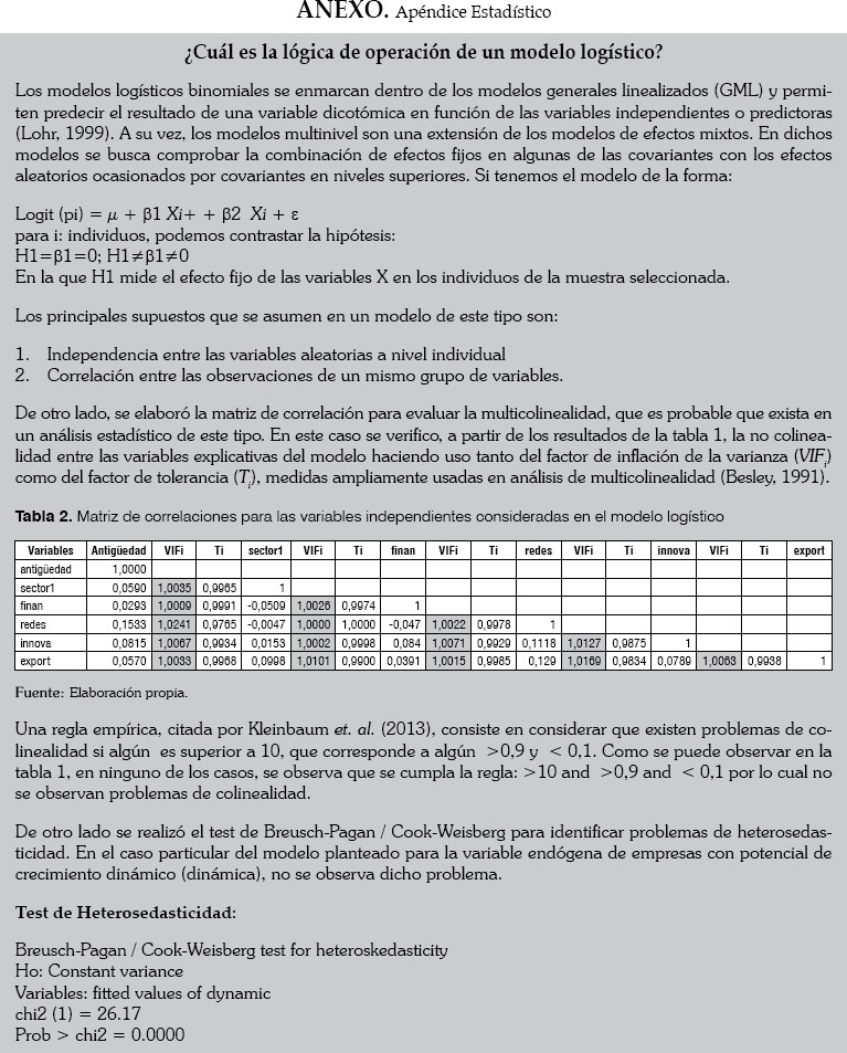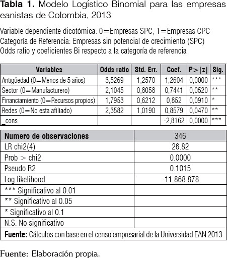 La muestra de empresas registradas en el Censo Empresarial de la Universidad EAN, permitió construir la variable dependiente "potencial" que discrimina entre aquellas empresas que tienen potencial de crecimiento de aquellas que no, considerando para su construcción las variables: total de ventas anuales y número de empleados. Al ser dicotómica la variable endógena dependiente, se trabajó bajo los supuestos del modelo logístico binomial para explicar la asociación entre las variables seleccionadas.