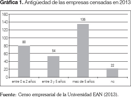 En el censo empresarial de la Universidad EAN 2013, 346 estudiantes afirmaron tener empresa o de propiedad de sus padres. De este número 292 empresas brindaron información completa, 54,5% de las cuales pertenecen a hombres y el 44,9% a mujeres. La mayor parte son estudiantes presenciales (92,8%) y solamente el 7,2% son egresados y se censaron de forma virtual. A su vez, se observa en la gráfica 1 que del total de empresas censadas, 46% (136) afirmaron tener más de 5 años de antigüedad.