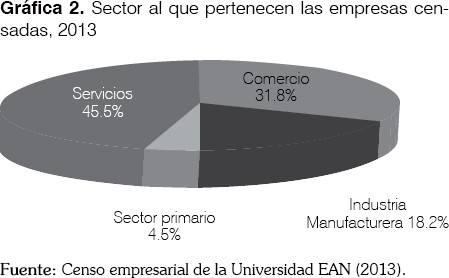 Los datos del censo empresarial permitieron identificar que las empresas censadas se desenvuelven en diferentes sectores. En la gráfica 2 se observa que El 45,5% pertenece al sector servicios, el 31,8% al sector comercio, el 18,2% a la Industria manufacturera o de transformación y solo el 4,5% al sector primario (extractivo o agropecuario).