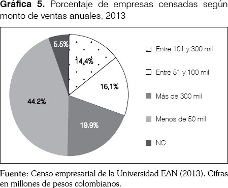 Según la gráfica 4 , la mayoría de las empresas censadas tienen menos de 10 empleados (74,3%). Un 19,2% entre 10 y 49 empleados, un 4,8% entre 50 y 199 empleados y solo el 1% de la muestra tiene más de 200 empleados. En la gráfica 5 se observa que según el monto total de ventas anuales, el 44,2% de las empresas perciben menos de 50 millones de pesos al año, el 16,1% entre 51 y 100 millones, el 14,4% entre 101 y 300 millones y el 20% más de 300 millones.