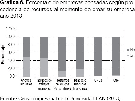 Respecto a la variable financiera, en la gráfica 6 se observa que cerca al 50% respondió que los recursos al momento de crear su empresa provenían de ahorros acumulados de la familia o de ingresos de trabajos anteriores (48,6% y 46,6% respectivamente). Solo el 13,4% indicó que provenían de préstamos de amigos o familiares y un 19,9% de bancos o entidades financieras.
