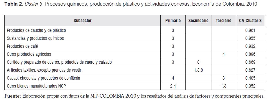 La tabla 2 expone los resultados correspondientes al Cluster 3. Destacan, por su grado de pertenencia, actividades relativas a procesos químicos y petroleros para la producción de plástico y caucho. Por su orientación productiva, este agrupamiento se denomina Procesos químicos, producción de plástico y actividades conexas.