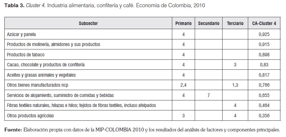 El Cluster 4 es evidencia de la orientación gastronómica de Colombia (tabla 3). Por la orientación de los subsectores en él contenidos se ha denominado Industria alimentaria, confitería y café. Denota, asimismo, la presencia de subsectores integrantes de la cadena de valor típica de esta actividad, a saber, los productos agrícolas, su procesamiento, empaquetamiento y distribución a partir de servicios relativos al suministro de comidas y bebidas. Es, por lo anterior, un cluster de representación holística de procesos económicos de agregación de valor.