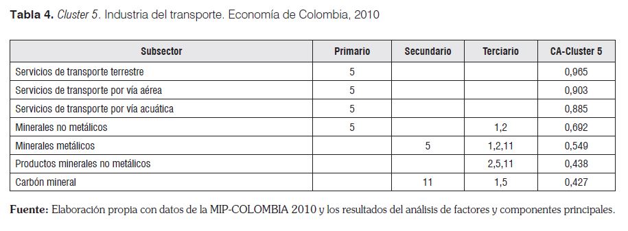 En la tabla 4 se muestran los resultados correspondientes a la conformación del Cluster 5. Es notoria la presencia de subsectores característicos de la industria del transporte. Destaca, asimismo, la inclusión de la industria minera metálica y no metálica, lo que sugiere la existencia de procesos transformadores, basados en minerales, de componentes para medios de transporte. Esto es particularmente lógico dada la inclusión de hidrocarburos en el ámbito de la minería no metálica.