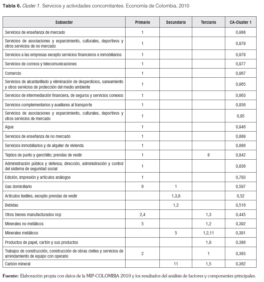 El primer agrupamiento identificado, dada su dimensión, se expone en la tabla 6 (ver anexos ). Se trata de un cluster que deriva, especialmente, de la naturaleza en la orientación multisectorial de la MIPCOLOMBIA 2010, primordialmente orientada a los servicios. Cuenta con actividades concomitantes primordialmente relacionadas con la generación y aprovechamiento de energía, lo que resulta congruente con el desempeño general de los procesos terciarios.