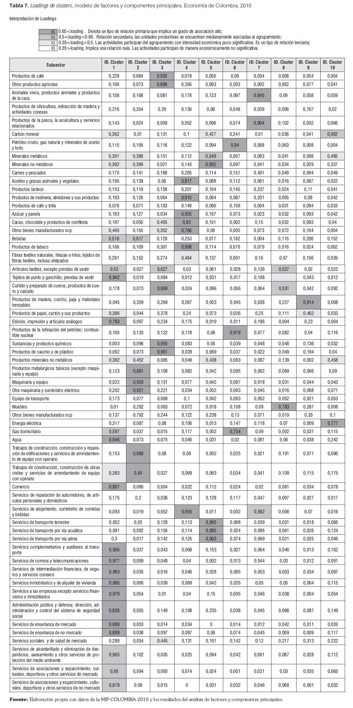 Los resultados se expresan en la matriz de componentes rotados derivada del modelo factorial de reducción de datos. Se identificaron 10 columnas correspondientes al mismo número de clusters. La referida matriz tiene tantas filas como sectores contiene la MIP-COLOMBIA 2010 y tantas columnas como agrupamientos identificados.