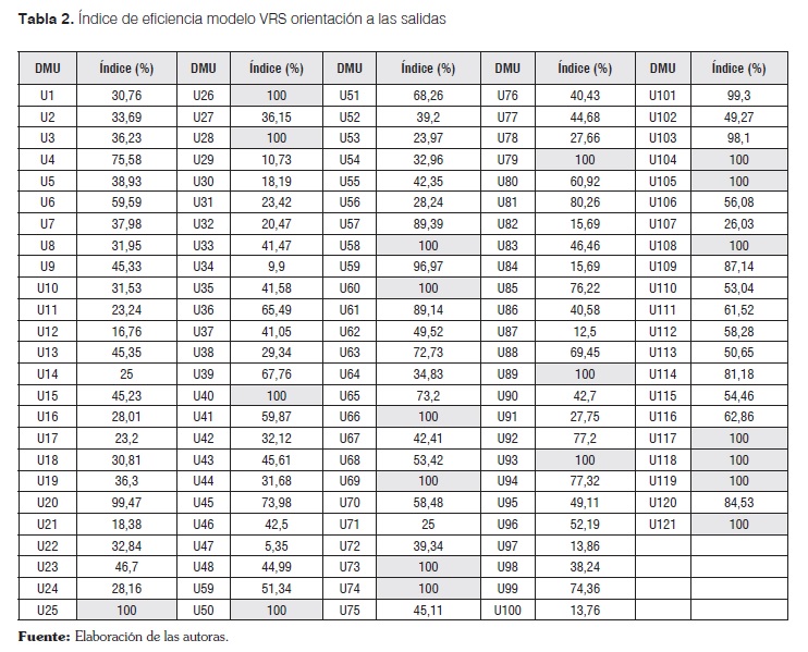 Los resultados del índice de eficiencia de las 121 DMU`s realizado a través de DEA, se presentan en la Tabla 2, donde se indica la finca analizada y el índice obtenido en un rango que va desde 0.00% a 100.0%, siendo este último el valor de máxima eficiencia posible para una DMU.