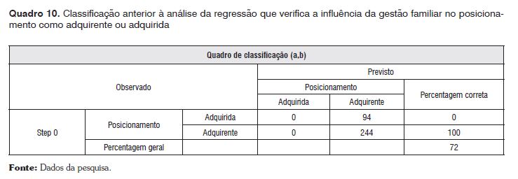 A seguir, apresentam-se os resultados oriundos da regressão logística, que permite averiguar a influência da gestão familiar no posicionamento como adquirente ou adquirida. O primeiro passo é demonstrar, conforme Quadro 10, como seriam classificadas as empresas caso o modelo se deixasse guiar apenas em função dos enquadramentos observados.