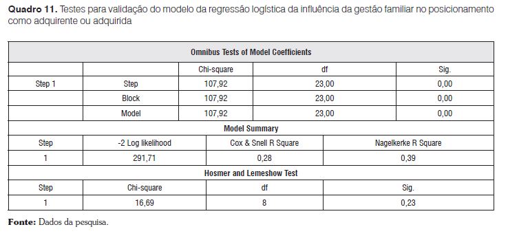 No Quadro 11, apresentam-se os testes Step, Block e Model, Hosmer & Lemeshow, e os indicadores -2LL, Cox-Snell R2 e Nagelkerke, que possibilitam analisar, após a inclusão das variáveis independentes, se o modelo pode ser considerado capaz de realizar as predições com a acurácia desejada.